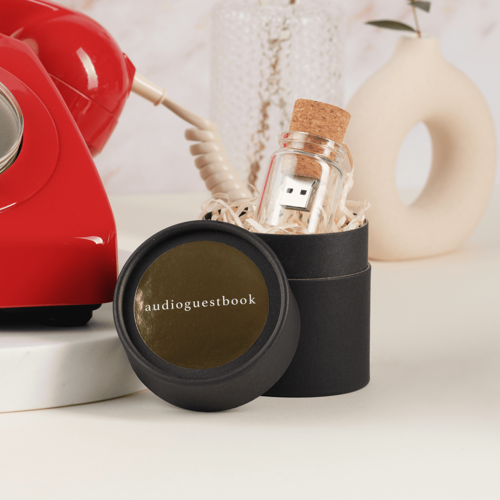 Your treasured recordings will be sent on a unique USB in a glass bottle and delivered no later than two weeks after the Audio Guest Book is returned.